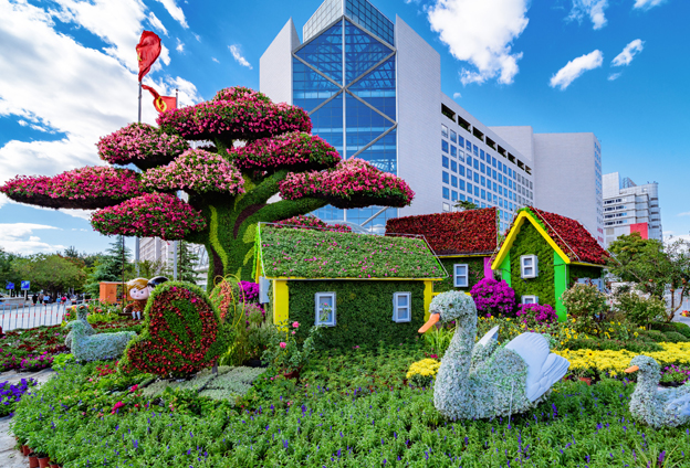 根据以往的经验,由专业的园艺团队提前做好每年100多个花卉品种的生产,常用的有四季海棠、凤仙、一品红、一串红、万寿菊、北京小菊等,这些花卉金秋盛开,色彩艳丽,花头繁茂,花期长,特别适合花坛的摆放,同时每年也适当增加部分新优品种,为花坛素材增加一些新鲜血液。今年是改革开放40周年,通过花坛反映了我们国家和老百姓的生活怎样的变化?今年是改革开放40周年,通过花坛反映了我们国家和老百姓的生活怎样的变化?