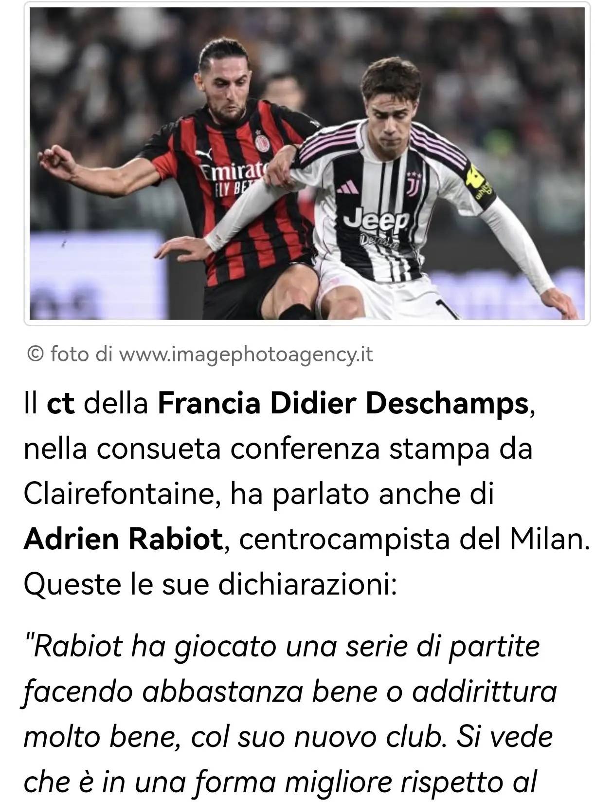 法国国家队主帅迪迪埃·德尚在克莱枫丹基地的例行新闻发布会上,也谈及了米兰中场球员阿德里安·拉比奥特: