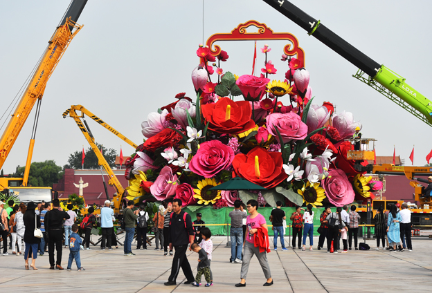 今年广场中心继续布置“祝福祖国”巨型花篮,长安街沿线年开始,“祝福祖国”巨型花篮就一直作为广场中心花坛,在国庆节期间向祖国献礼。今年广场中心继续布置“祝福祖国”巨型花篮。花篮为钢架结构,篮身为玻璃钢材质,可抗10级风。