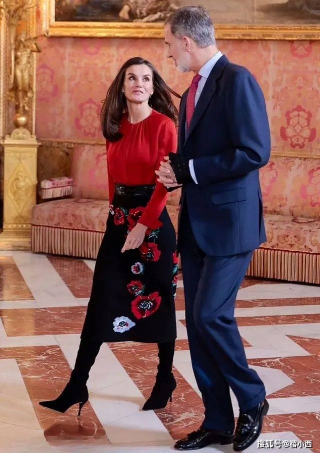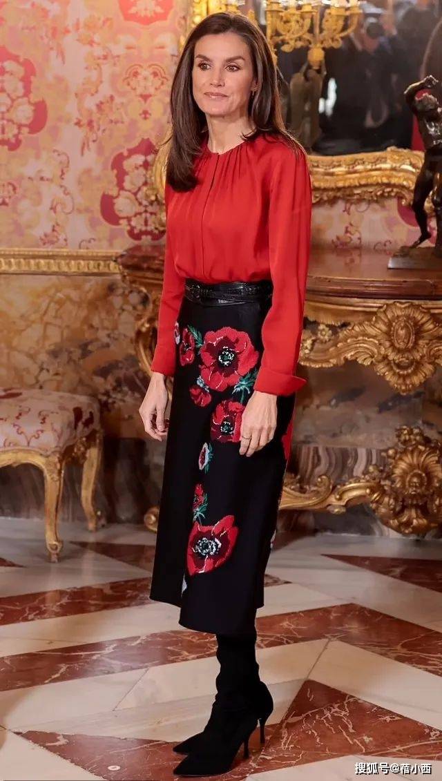 红色作为永不过时的经典色,象征着热情与活力。莱蒂齐亚选择的这件红色衬衫,裁剪合身,材质考究,既显贵气,又表达了她的自信。与黑色半身裙的搭配相得益彰,呈现出层次感十足的造型。