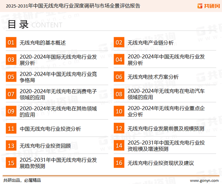 共研产业研究院通过对公开信息分析、业内资深人士和相关企业高管的深度访谈,以及分析师专业性判断和评价撰写了《2025-2031年中国无线充电行业深度调研与市场全景评估报告》。本报告为无线充电企业决策人及投资者提供了重要参考依据。