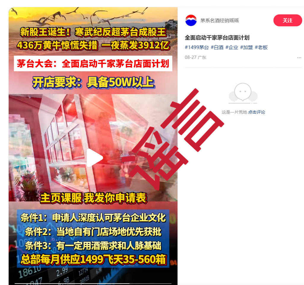 “算法的核心逻辑是追求流量,它只判断内容是否吸引眼球,不辨别真假。”杨逐原分析,茅台本身自带流量,公众关注度高,而“开放加盟”“直采飞天”等关键词极易引发高点击与互动,从而被算法识别为热门内容进一步推广。