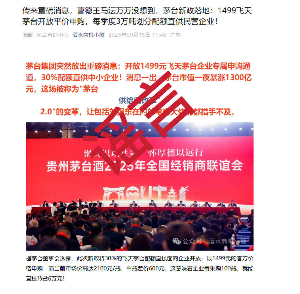 除了假冒招商,另一类虚假信息则集中在“企业专享申购”上。记者获取的一则传播较广的信息显示:“茅台开放飞天茅台企业专属申购通道,30%配额直供中小企业!每采购100瓶直接节省6万元,茅台市值一夜暴涨1300亿元印证市场热度。”
